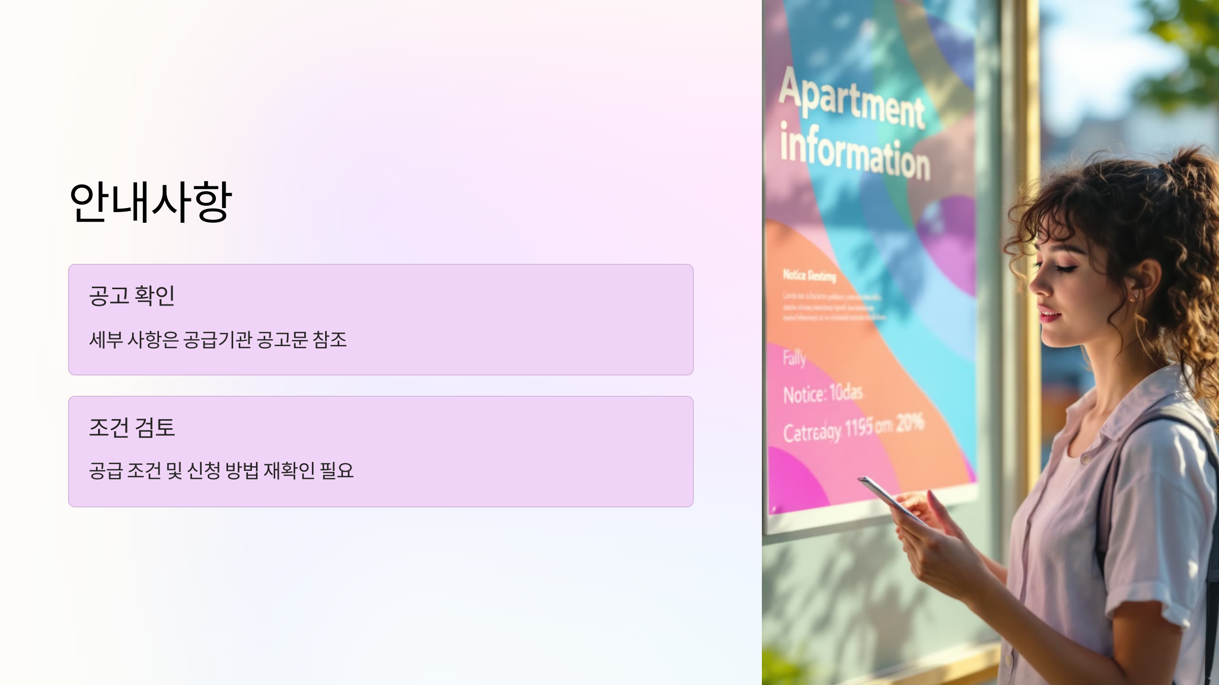 마지막으로, 신청 전 반드시 공고문을 다시 한번 확인하시고, 자세한 내용은 공급기관의 공식 채널을 통해 문의하시기 바랍니다.