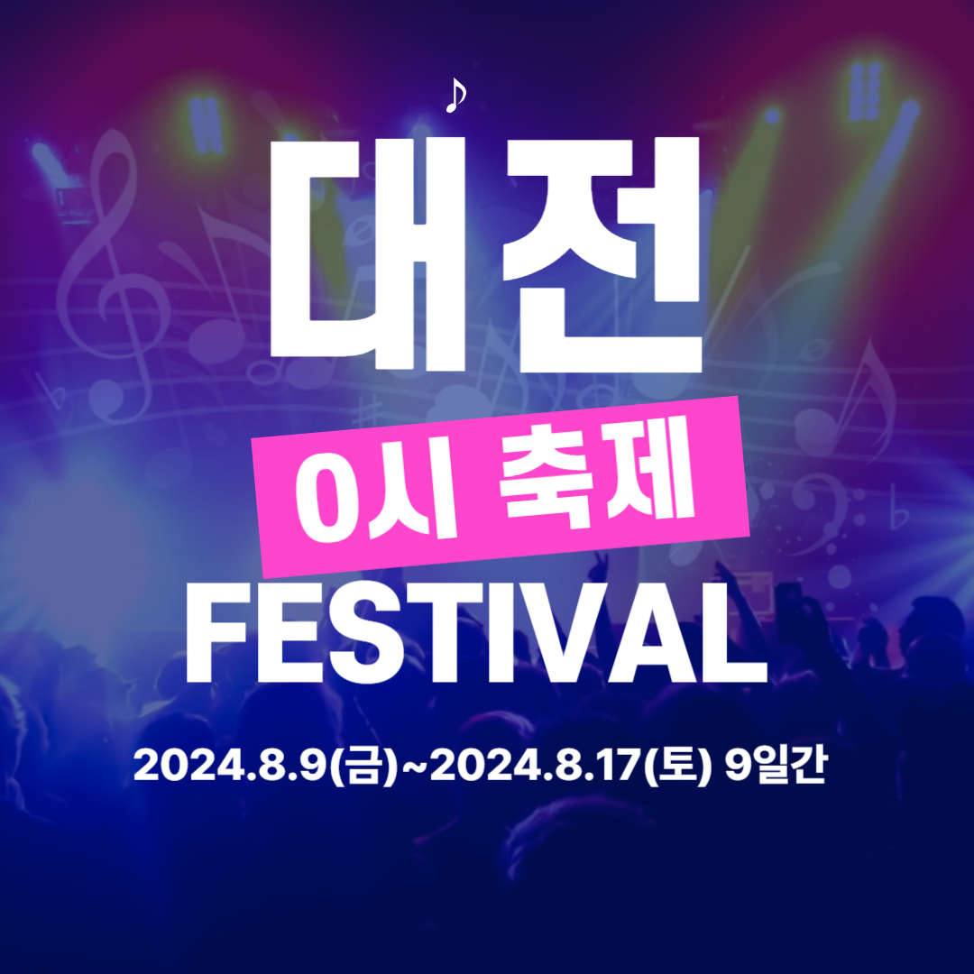 대전 0시 축제는 대전에서 열리는 가장 큰 행사 입니다. 축제 기간은 8월9일(금) 부터 8월17일(토)까지 총 9일간 진행 됩니다.