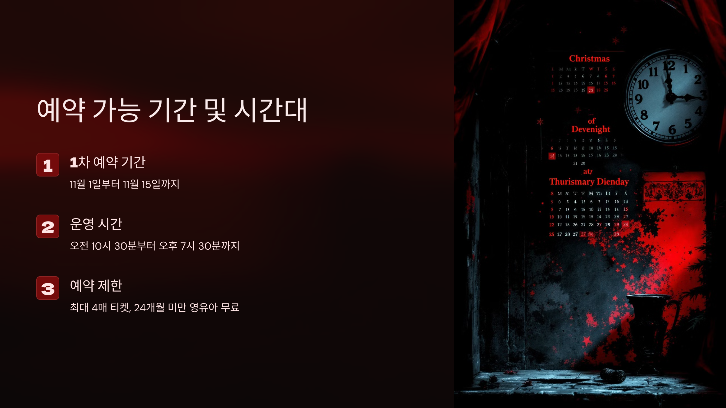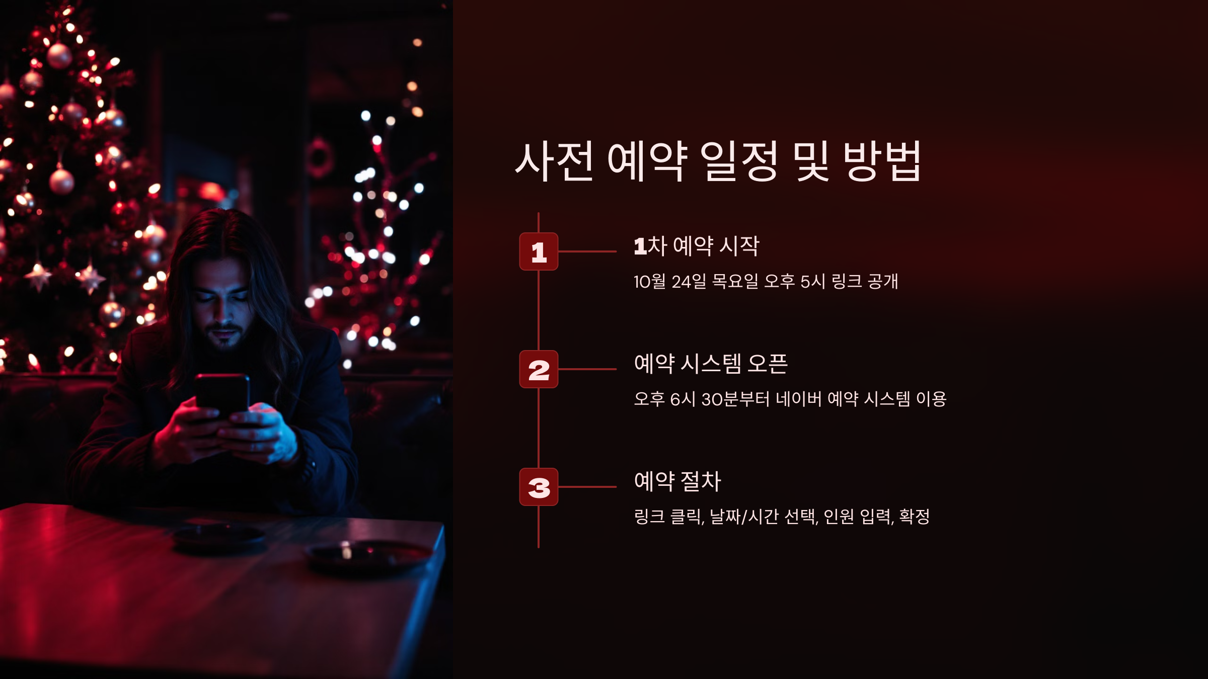 1차 사전 예약 기간은 11월 1일부터 11월 15일까지 진행됩니다. 예약은 30분 단위로 가능하며, 첫 번째 타임은 오전 10시 30분부터 오전 11시 30분까지, 마지막 타임은 오후 6시 30분부터 오후 7시 30분입니다. 만약 연장이 필요하다면, 오후 7시 30분부터 오후 8시 30분까지 추가 입장이 가능합니다.