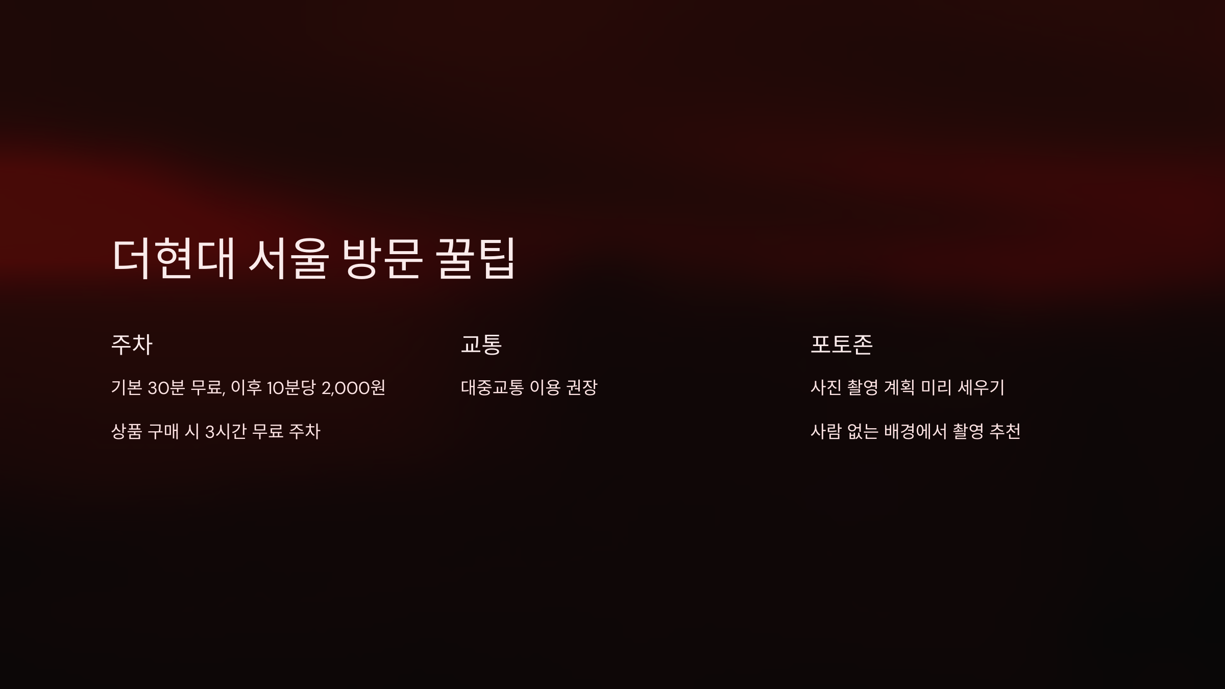 더현대 서울은 많은 인파가 몰릴 것으로 예상되기 때문에 주차가 다소 불편할 수 있습니다. 주차장은 기본 30분 무료이나 이후에는 10분당 2,000원의 요금이 부과되니 참고하세요. 상품 구매 금액에 따라 3시간까지 무료 주차가 가능하지만, 되도록이면 대중교통을 이용하는 것이 좋습니다.
