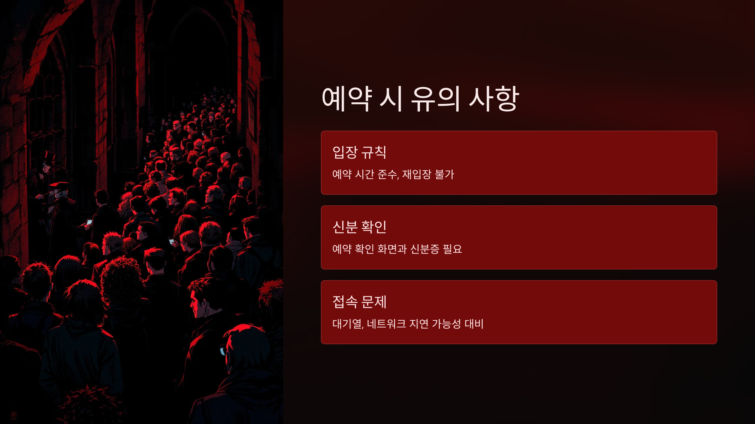 예약된 시간에 맞춰 입장할 경우 재입장은 불가하며, 입장 시에는 예약 확인 화면과 함께 신분증 확인이 진행됩니다. 많은 사람들이 이 행사를 기대하고 있는 만큼, 예약 오픈 당일 접속이 불안정할 수 있는데요, 대기열 문제나 네트워크 지연 상황을 대비해 몇 가지 주의사항을 알려드리겠습니다.