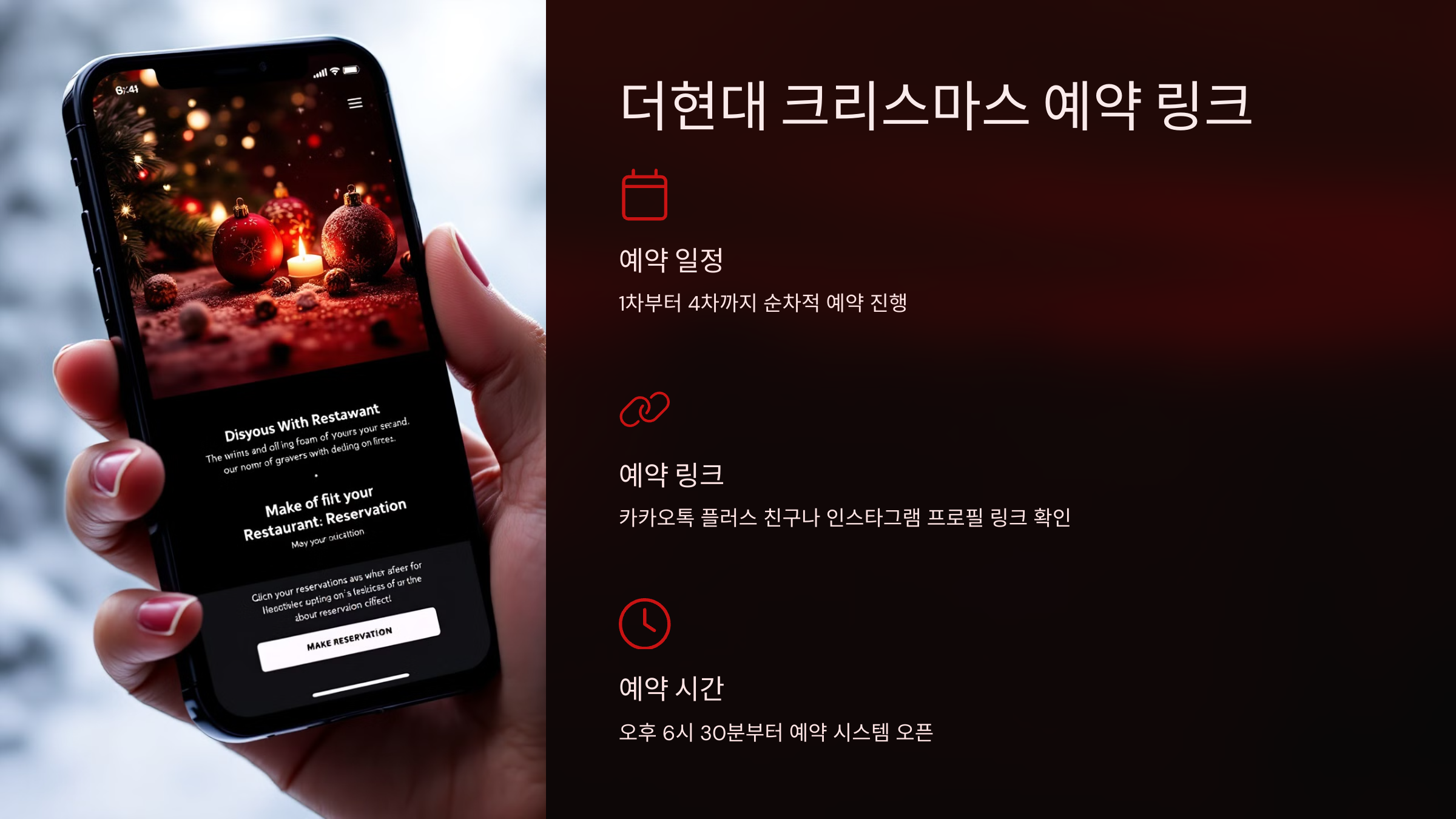 더현대 서울 크리스마스 빌리지는 사전 예약제로 운영되며, 1차부터 4차까지 순차적으로 예약이 진행됩니다. 1차 예약은 10월 24일 목요일 오후 5시에 시작되며, 카카오톡 플러스 친구 메시지나 인스타그램 프로필 링크를 통해 예약 링크가 공개됩니다. 링크에 접속 후 오후 6시 30분부터 네이버 예약 시스템을 통해 예약을 완료할 수 있습니다.