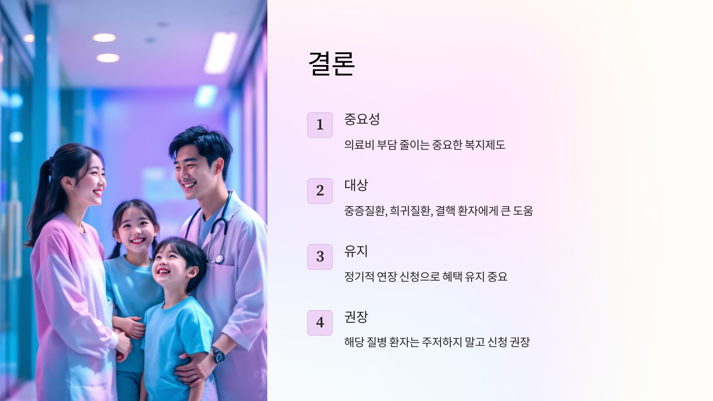 산정특례제도는 의료비 부담을 줄여주는 중요한 복지제도입니다. 특히 중증질환이나 희귀질환, 결핵 환자 등 지속적인 치료가 필요한 분들에게 큰 도움이 됩니다. 산정특례 혜택을 신청하고 활용하기 위해서는 병원의 진단서 발급, 국민건강보험공단에 신청, 그리고 정기적인 연장 신청을 통해 혜택을 유지하는 것이 중요합니다.