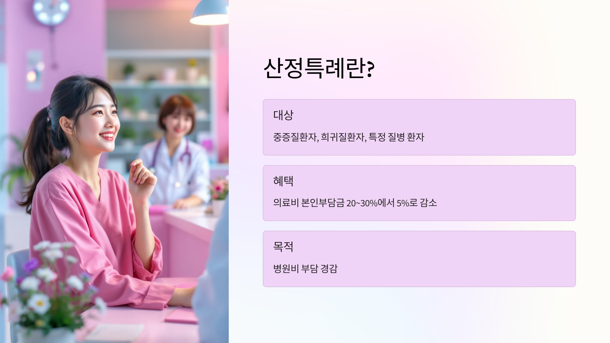 산정특례는 국민건강보험에서 중증질환자나 희귀질환자, 그리고 특정한 질병을 앓고 있는 환자들에게 병원비 부담을 경감시키는 제도입니다. 일반적으로 의료비의 20~30%가 환자 본인부담금으로 책정되지만, 산정특례를 적용받으면 본인부담금이 5%까지 낮아지게 됩니다.