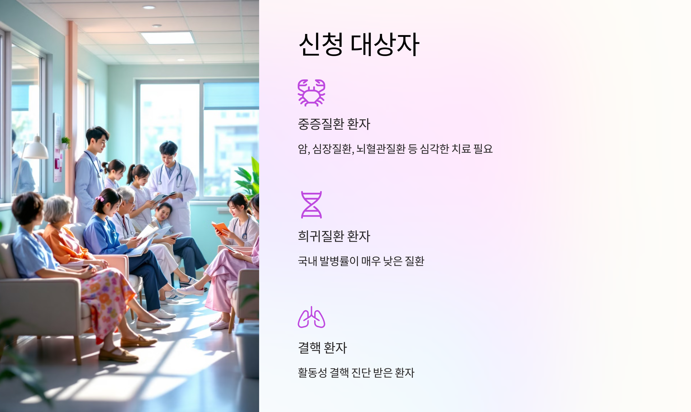 - 중증질환 환자: 암 환자, 심장질환 또는 뇌혈관질환 등 심각한 치료가 필요한 질환자