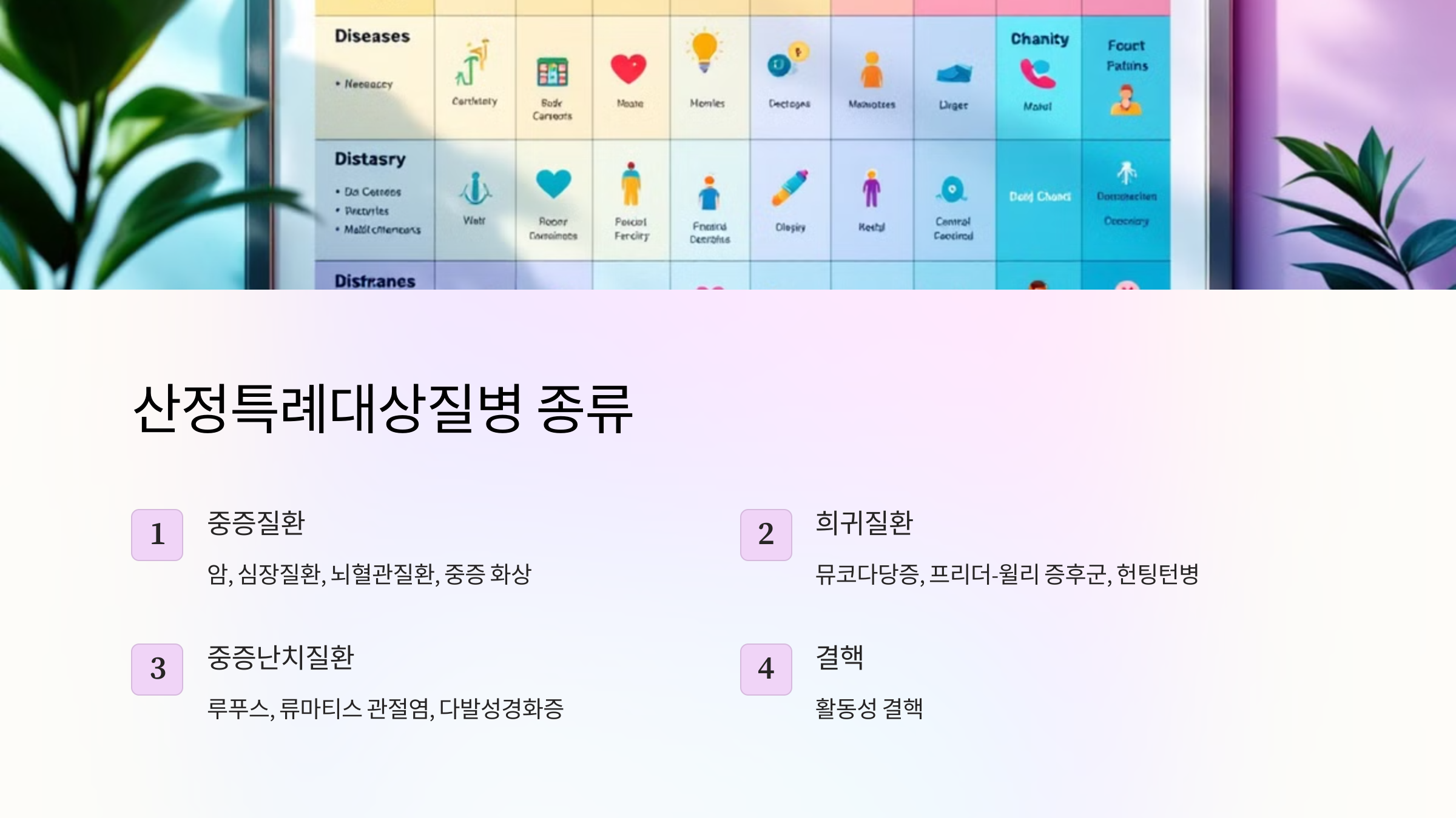 산정특례대상질병은 크게 중증질환, 희귀질환, 중증난치질환, 결핵 등이 포함됩니다. 각각의 범주에 해당하는 대표적인 질병들을 아래에 나열했습니다.
