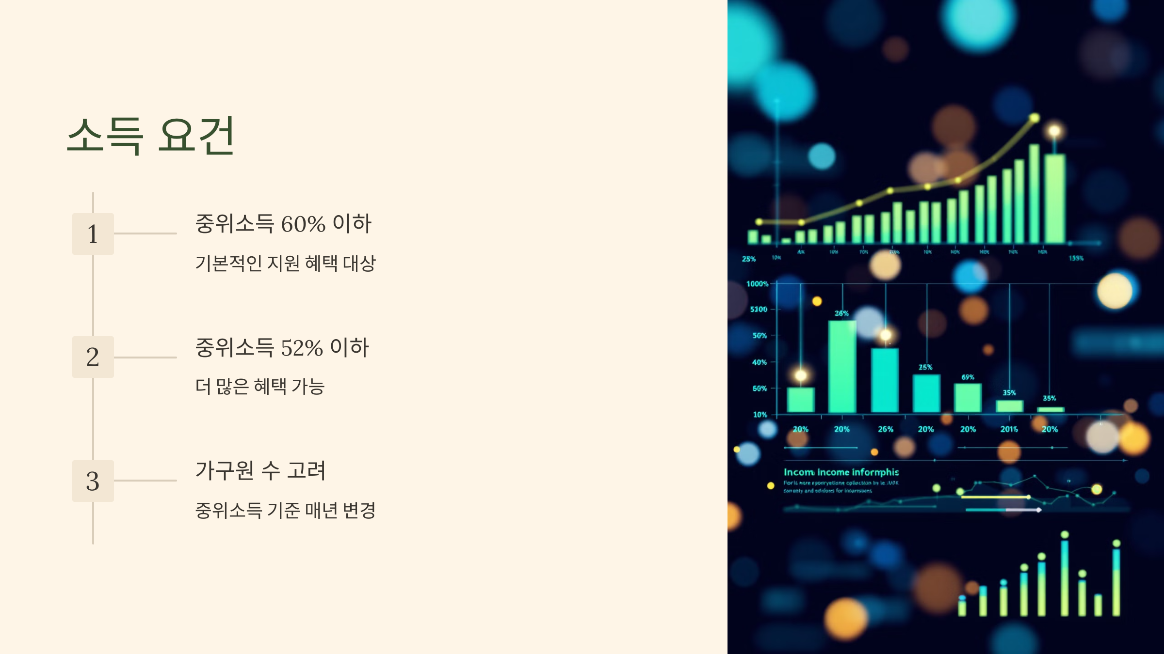 - 중위소득 52% 이하: 이 기준 이하의 소득을 가진 가구는 더 많은 혜택을 받을 수 있습니다. 예를 들어, 일부 지역에서는 교육비 지원, 긴급 생계비 지원 등 다양한 추가 혜택이 제공될 수 있습니다.